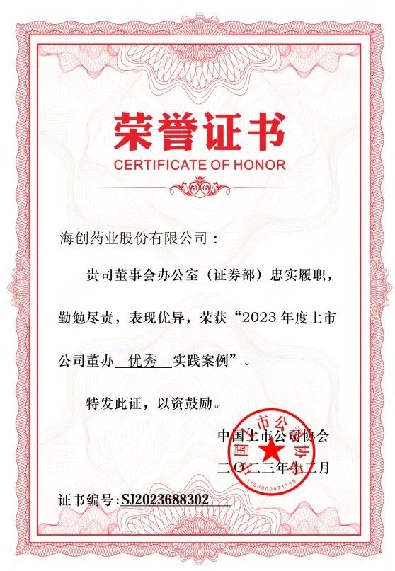 祝賀|海創(chuàng)藥業(yè)榮獲中國上市公司協(xié)會(huì)“2023上市公司董辦優(yōu)秀實(shí)踐案例”